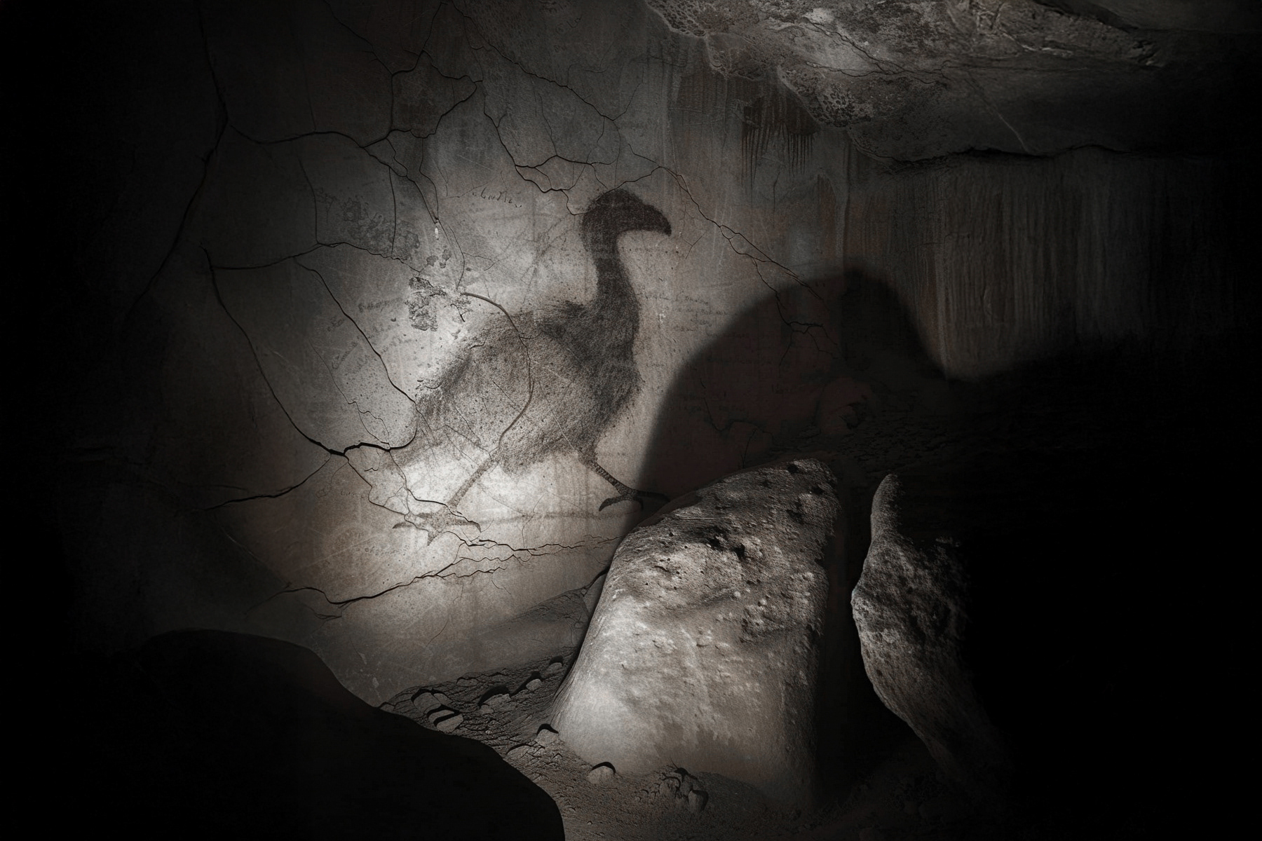 Lorsque l’on s’aventure plus profondément dans la grotte, les parois commencent à raconter des récits des temps anciens. Parmi les ombres, des scènes de chasse se dévoilent, capturant la poursuite du dodo désormais éteint. Ces peintures rupestres insufflent la vie dans un monde depuis longtemps disparu, à une époque où la survie d'une espèce pouvait signifier l'extinction d'une autre. Loris Gazut © - - - As one delves deeper into the cave, the walls begin to narrate tales of ancient times. Amongst the shadows, scenes of hunting unfold, capturing the pursuit of the now-extinct dodo. These cave paintings breathe life into a world long gone, a time when the survival of one species could mean the extinction of another. Loris Gazut ©